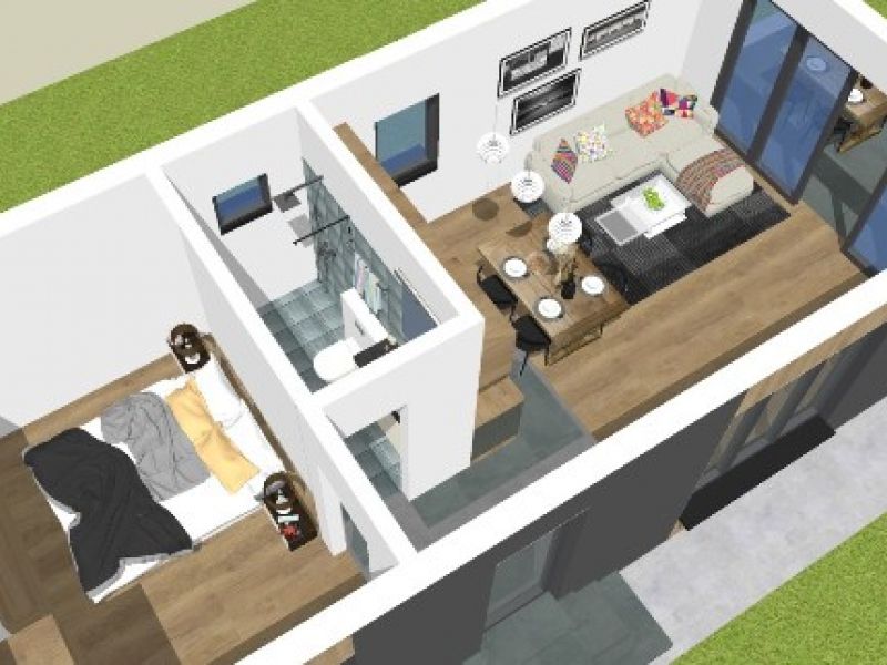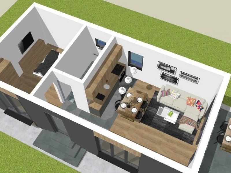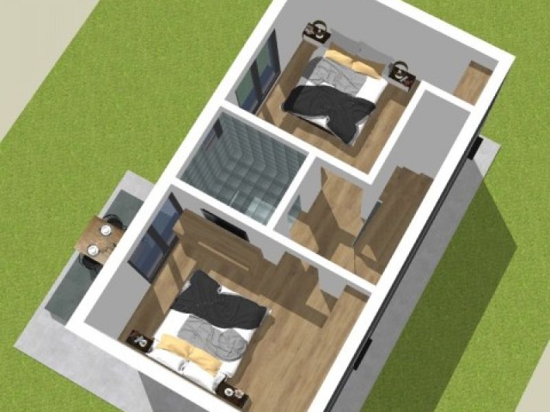 - vila individuala de 2-6 persoane cu 3 camere, suprafat construita 85 mp si curte (libera) 250-300 mp - pret 120.000 euro; acesta varianta genereaza eficienta energetica ridicata si costuri scazute pentru consumator fiind dotate cu pompe de caldura si panouri fotovoltaice 5 KW .